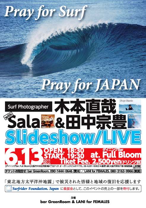 それから6月13日(月)念願のフォトグラファー木本直哉をむかえて写真スライドショーにSala 田中宗豊の音楽トークショーも混ぜて大阪市内Full Bloomでやることに決定 、START PM7:00~ (GREEN ROOMより)